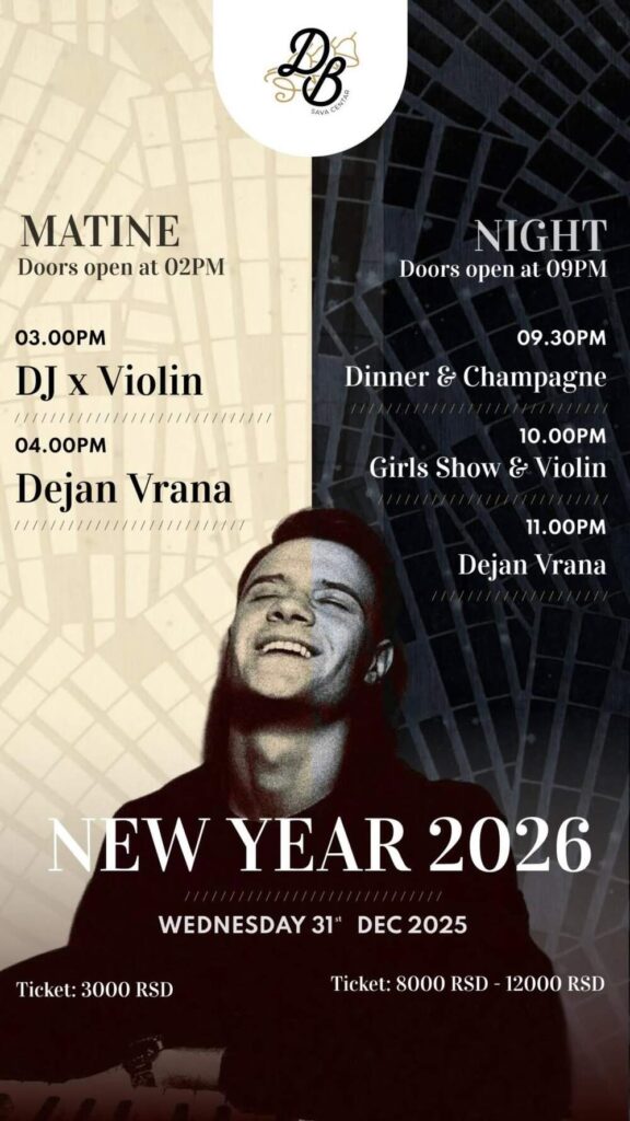 Uživajte u nezaboravnoj večeri uz muziku Dejana Vrane, koji će vas zabavljati tokom cele noći, kao i uz spektakularni Girls Show & Violin. Ova kombinacija zabave i vrhunske hrane stvara jedinstvenu atmosferu koja će vas oduševiti. Piće je dostupno po utrošku, a svi gosti dobijaju i piće dobrodošlice, što dodatno doprinosi svečanom ugođaju.